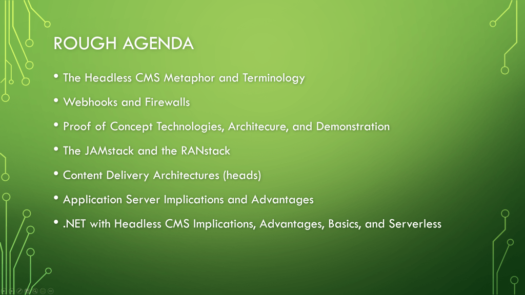 Last week (18.Jan.2021) I conducted a webinar hosted by my friends at Konabos Consulting about Jamstack and alternative architectures for headless CMS with ASP.NET. I talked about the headless CMS metaphor and terminology and getting webhooks through firewalls before conducting a short technical demonstration of a proof of concept using the Contentstack SaaS headless CMS with Algolia search and ngrok. Then I described what I call the RANstack (REST, Any programming language, and Notation), which I see as the foundation of the JAMstack (JavaScript, [REST] APIs, and Markup). I mentioned some of the advantages and implications of adding an application server in the content delivery tier, including those specific to ASP.NET Core, and some of the basics of using .NET with a headless CMS. There were a few questions at the end. Interestingly, afterwards I heard that there is a trend emerging of putting application servers in the content delivery tier rather than using static files. This pendulum has been swinging back and forth since the dawn of the Internet (anyone remember CGI-BIN?).