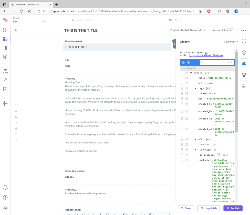 I renamed the custom Contentstack widget that I had previously developed to render the JSON of an entry to include links to Developer and added links to edit the content type and preview the page. I did not have to change any HTML or JavaScript to get this to work in the new (2021) Contentstack Venus user interface.