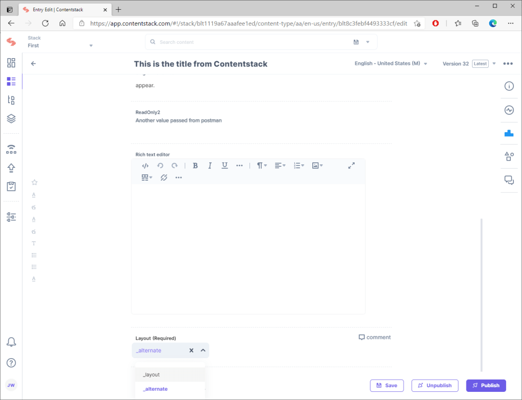 In a global field common to all Contentstack content types that represent types of pages, implement two select fields: one named Layout to allow the CMS user to select a layout and another named Partial to let them select a partial view. In the list of values for the layout field, add the names of the layout files from which the user must select one (_layout and _alternate in my case) and make the field mandatory. In the list of values for the Partial field, enter the names of the partial views from which the user must select one (partial and alternate in my case), and make the field mandatory. Create corresponding properties in the EntryModelBase class.