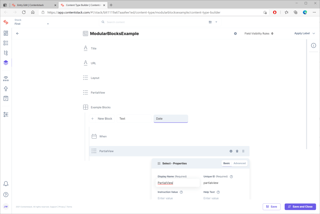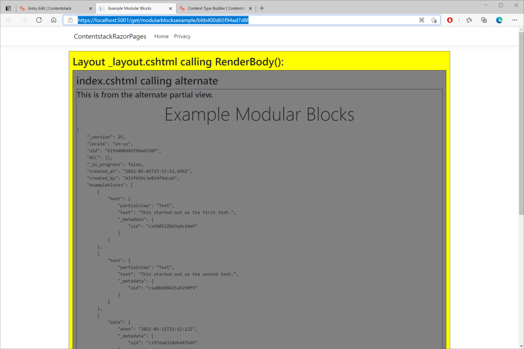 This blog post provides an example of using a modular field in the Contentstack SaaS headless CMS to let the CMS user select an ASP.NET Core Razor Pages partial view to render each block. This blog post depends on information and code provided in the following previous blog posts.