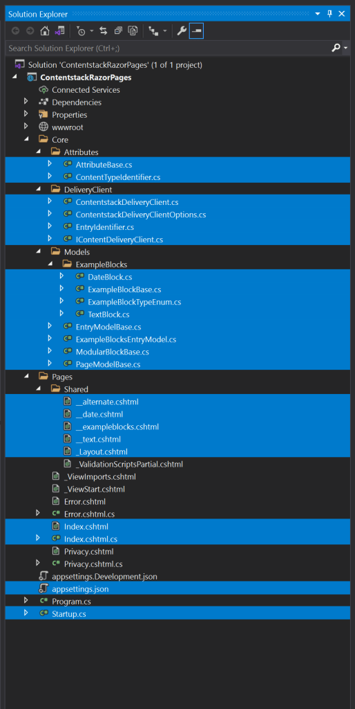 WordPress won’t let me upload a zip of the solution, but this link to an archive in my OneDrive public temp folder should work for anyone is interested in giving this a test run, until I change the delivery token (which provides read-only access to Contentstack) or the link breaks, in which case feel free to contact me for current code.