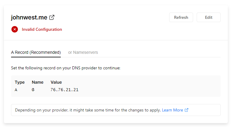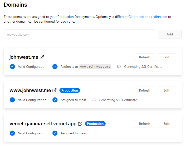 Vercel also generates some handy SSL certificates and redirects from HTTP to HTTPS.