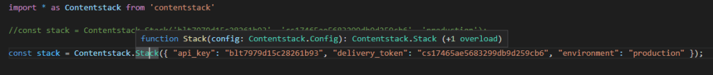 The signature '(api_key: string, access_token: string, environment_name: string, region?: string, fetchOptions?: object): Stack' of 'Contentstack.Stack' is deprecated. ts(6387)