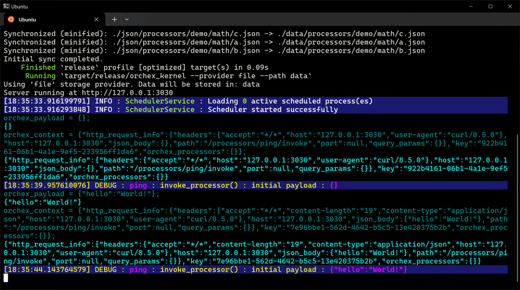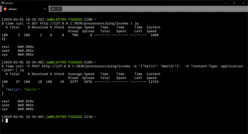 time curl -X POST http://127.0.0.1:3030/processors/ping/invoke -d '{"hello": "World!"}' -H "Content-Type: application/json" | jq