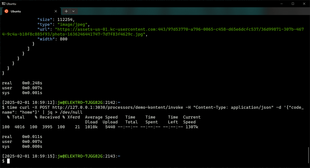 time curl -X POST http://127.0.0.1:3030/processors/demo-kontent/invoke -H "Content-Type: application/json" -d '{code_name": "home"}' | jq