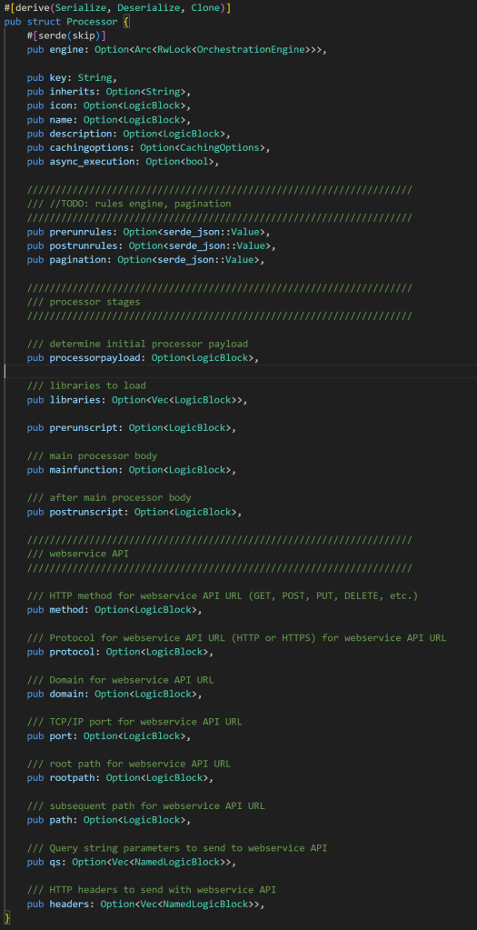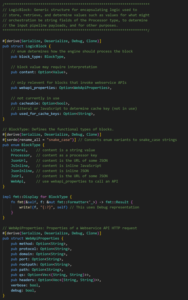 Not all types of LogicBlocks are relevant to all cases where the solution uses LogicBlocks. For example, Orchex uses LogicBlocks to define processor names. In this context, Literal and JsInline are relevant, where Literal is most typical. The identifier of a processor is not typically the key of another processor, nor is it a JSON value, and JavaScript libraries and webservice APIs are not typically relevant to determining the name of a processor. WebApi is only relevant during the stage of a processor that defines values for a webservice API call. Here is the Rust definition of a LogicBlock, the enum that defines the types of blocks, and a substructure used for blocks that invoke Webservice APIs: