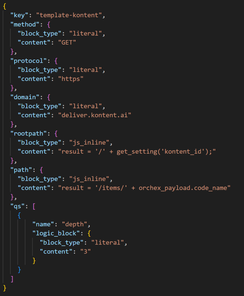 This processor hard-codes the depth query string parameter passed to the Kontent.ai webservice API, which determines how many levels of referenced items to include with the requested item (Kontent.ai modular content). We could change block_type for that logic_block to js_inline and then content to JavaScript that reads this query string parameter for the Kontent.ai API from the payload, or a query string passed to the orchestration process in the HTTP request and defaults to 1 if neither is present.