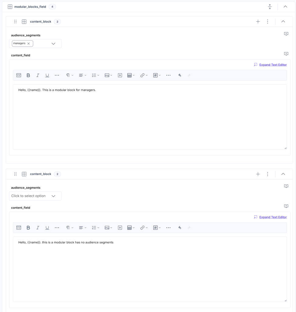 We have a content type in Contentstack that has a modular blocks field that contains two nested fields: one to select audience segments for targeting the content and another to contain HTML content. The data looks like this: