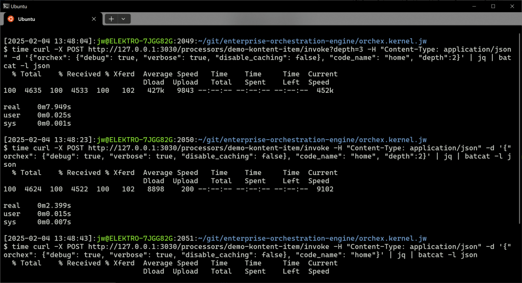 time curl -X POST http://127.0.0.1:3030/processors/demo-kontent-item/invoke -H "Content-Type: application/json" -d '{"orchex": {"debug": true, "verbose": true, "disable_caching": false}, "code_name": "home", "depth":2}' | jq | batcat -l json