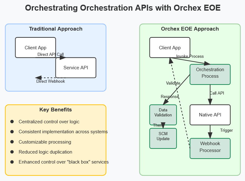 Rather than invoking EOE native webservice APIs, we can implement an orchestration processor that calls the native webservice API, and add additional processors to implement an orchestration process that performs the desired functionality. We can do the same thing around webhooks – rather than the EOE generating the HTTP request to a webhook listener directly, the EOE can invoke an orchestration processor that defines functionality equivalent to what a direct webhook would otherwise do.
