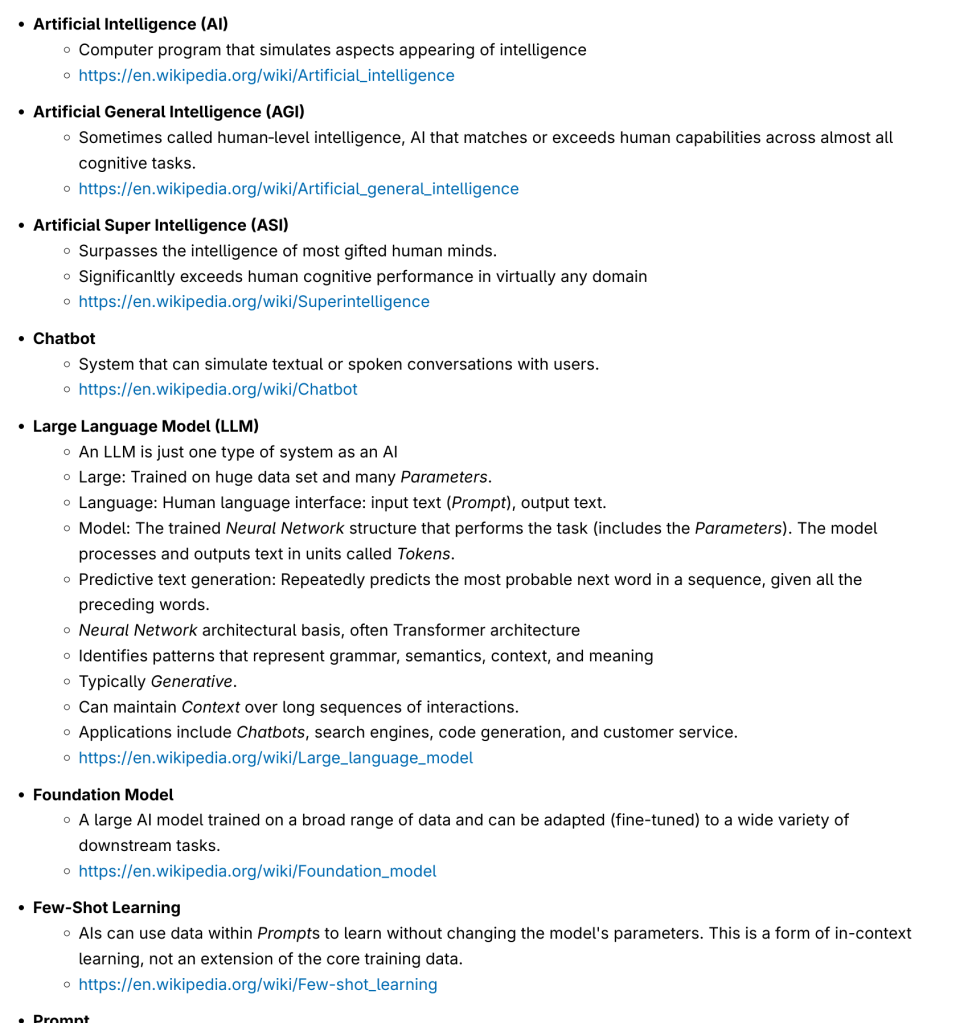 This article presents a cheat sheet for terms and concepts related to Artificial Intelligence (AI). Much of this may assume LLM as a context. Some is copied directly from Wikipedia or google gemini output. Note that I have no education or expertise regarding AI; this effort definitely turned into a number of rabbit holes. Assume AI as the context for each of these terms and their explanations. These terms can be somewhat circular in use and hence appear in no particular order. If you have any terms or content to add or correct, please comment. I spent too much time on this already but would be happy to pass the markdown to anyone that might want to work on this in anyway.