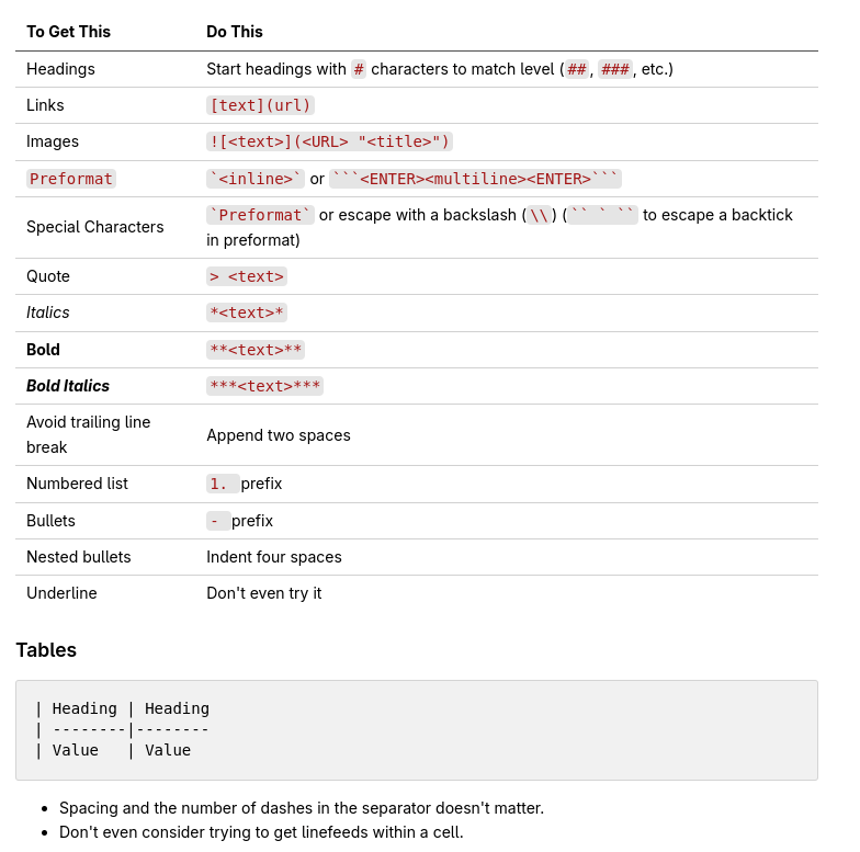 This is my personal markdown cheat sheet. Markdown and its limitations kinda suck, but it’s pretty simple, relatively universal, and much better than HTML for writing with simple formatting. To Get This Do This Headings Start headings with # characters to match level (##, ###, etc.) Links [text](url) Images  Preformat `<inline>` or “`<ENTER><multiline><ENTER>“` Special Characters `Preformat` or escape withContinue reading “My Markdown Cheat Sheet”